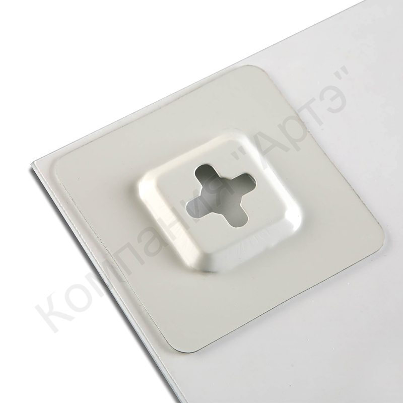 Крепление в виде пластины с крестообразным отверстием для подвешивания зеркала на вертикальной поверхности. С помощью данного крепления зеркало легко крепится и прочно фиксируется на стене.