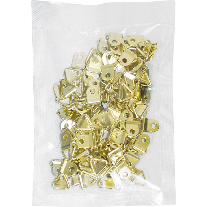 Стальная подвесная пластина для среднего веса картин. Прочные подвеска состоит из треугольного кольца, закрепленного со стальной пластиной. Пластина крепится с помощью одного шурупа к рамам из дерева, пластика, MDF. Между подвесками протягивается трос, либо кольцо продевается на шурупы в стене.