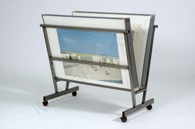 Напольная стойка для демонстрации образцов репродукций в листах, которую можно разместить в офисах багетных мастерских и выставочных залах. С её помощью можно одновременно представить большее количество образцов художественных полотен в ограниченных по площади помещениях. Стойка изготовлена из стали (покрытой порошковой краской) поэтому количество образцов ограничивает только ее V-образный размах, который равен 30 см.