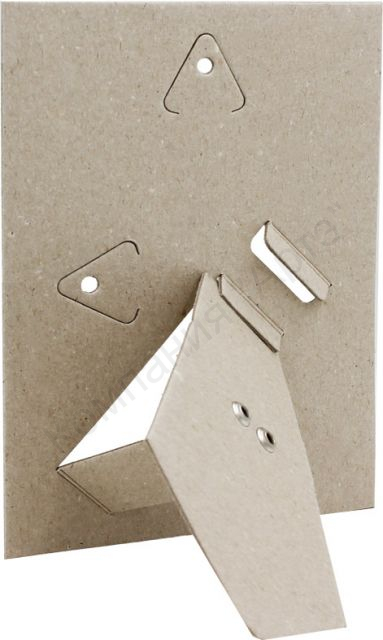 Картонный задник с ножкой используется при изготовлении фоторамок. Он имеет ножку и специальные отверстия для подвешивания, благодаря чему возможно как горизонтальное, так и вертикальное расположение. Разместить рамку можно будет не только на столе, но и на стене. Угол наклона ножки можно регулировать, для этого имеються специальные проушины.