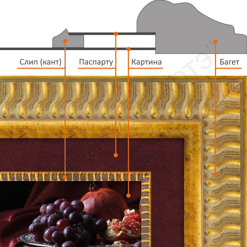 Также кант используется для изготовления составной рамки из багета. Слип придаёт дополнительный объём и колористический эффект. Наиболее гармонично выглядит сочетание широкого багета и узкого канта.