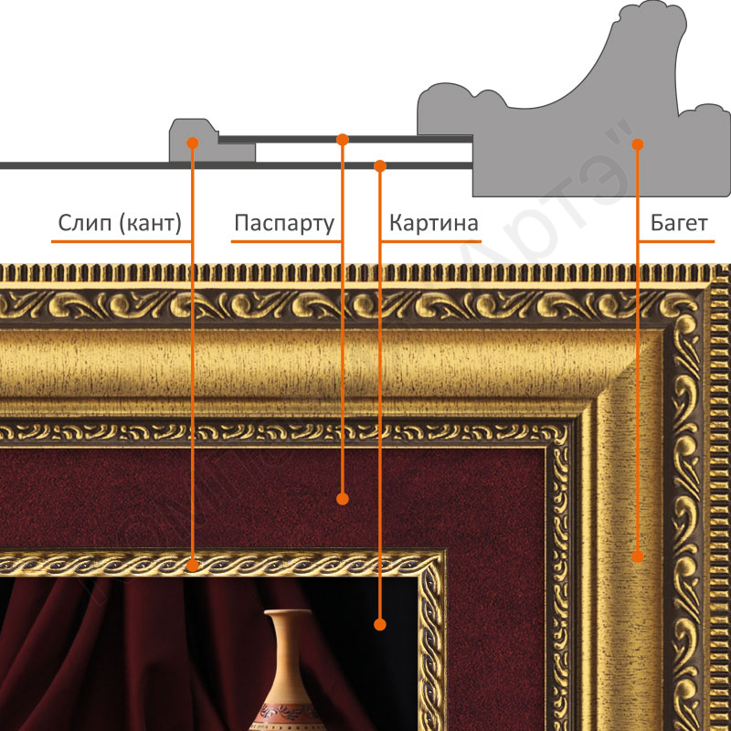 Окантовка паспарту слипом делается для того, чтобы добавить в композицию больше декора и создать объём внутри рамы, также его узкая планка служит для визуального отделения паспарту от оформляемой работы. Схему обрамления картины багетом и паспарту с окантовкой слипом вы можете увидеть на одной из картинок выше.