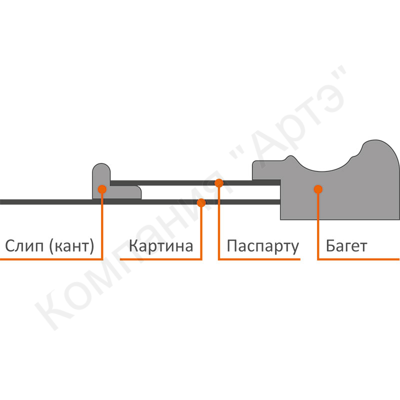 Окантовка паспарту слипом делается для того, чтобы добавить в композицию больше декора и создать объём внутри рамы, также его узкая планка служит для визуального отделения паспарту от оформляемой работы. Схему обрамления картины багетом и паспарту с окантовкой слипом вы можете увидеть на одной из картинок выше.