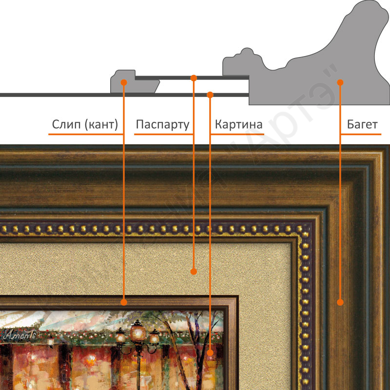 Окантовка паспарту слипом делается для того, чтобы добавить в композицию больше декора и создать объём внутри рамы, также его узкая планка служит для визуального отделения паспарту от оформляемой работы. Схему обрамления картины багетом и паспарту с окантовкой слипом вы можете увидеть на одной из картинок выше.