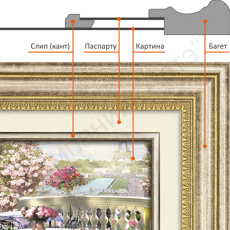 Окантовка паспарту слипом делается для того, чтобы добавить в композицию больше декора и создать объём внутри рамы, также его узкая планка служит для визуального отделения паспарту от оформляемой работы. Схему обрамления картины багетом и паспарту с окантовкой слипом вы можете увидеть на одной из картинок выше.