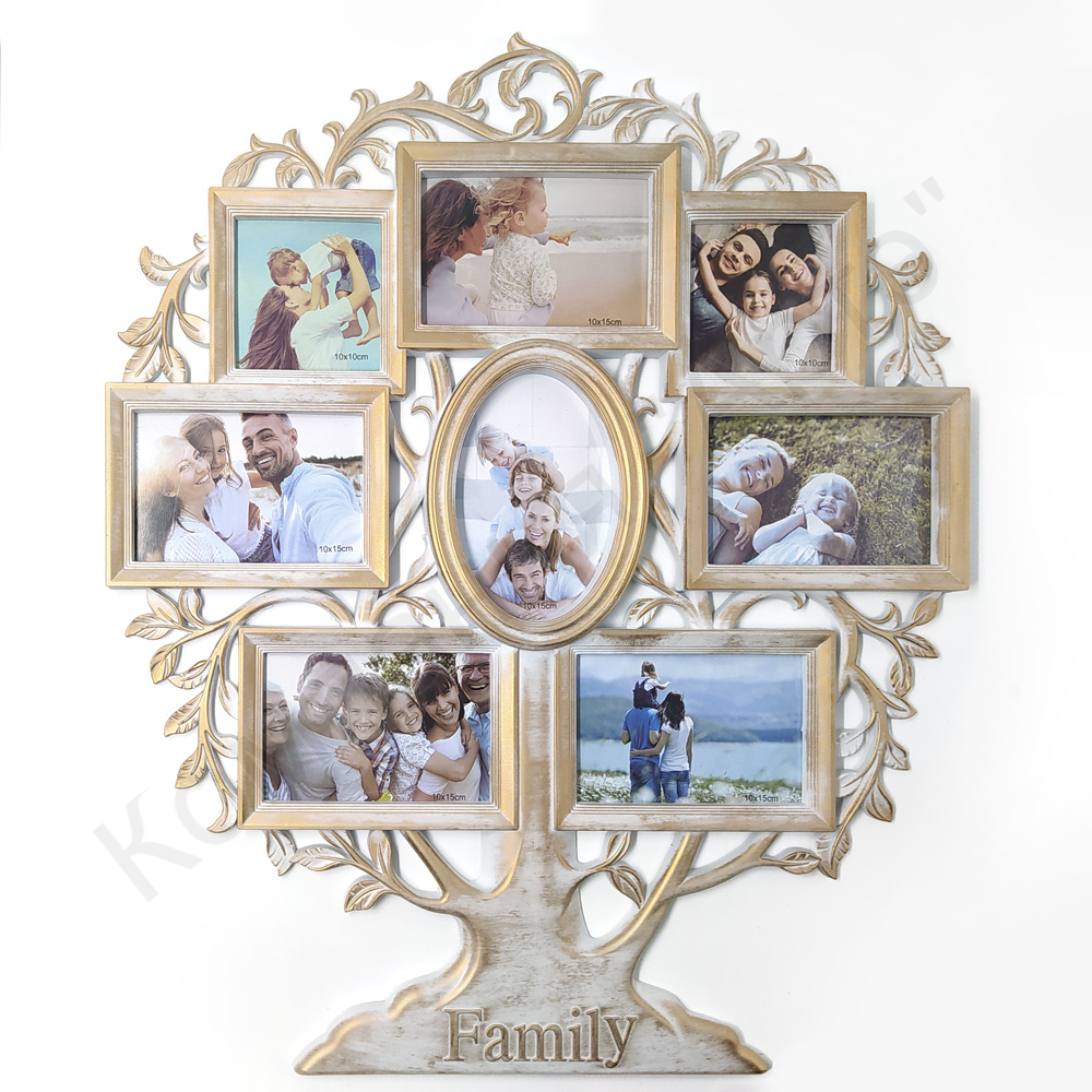 Фоторамка с пятью ячейками для фотографий 10 х 15 см горизонтального расположения, и одна овальная ячейка 10 х 15 см вертикального расположения, еще две квадлатных ячейки для фотографий 10 х 10 см.
