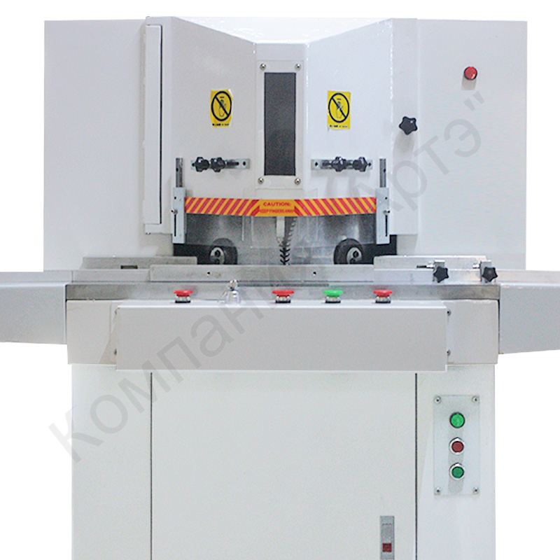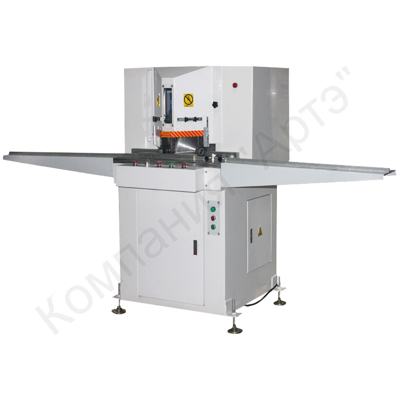 Станок оснащен двумя пилами с фиксированным углом распила 45° с двух сторон, пневматической системой подачи пильного блока и прижимом заготовки.