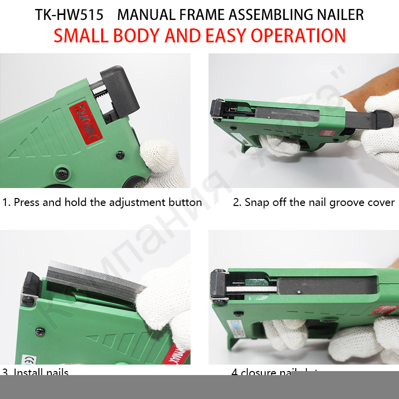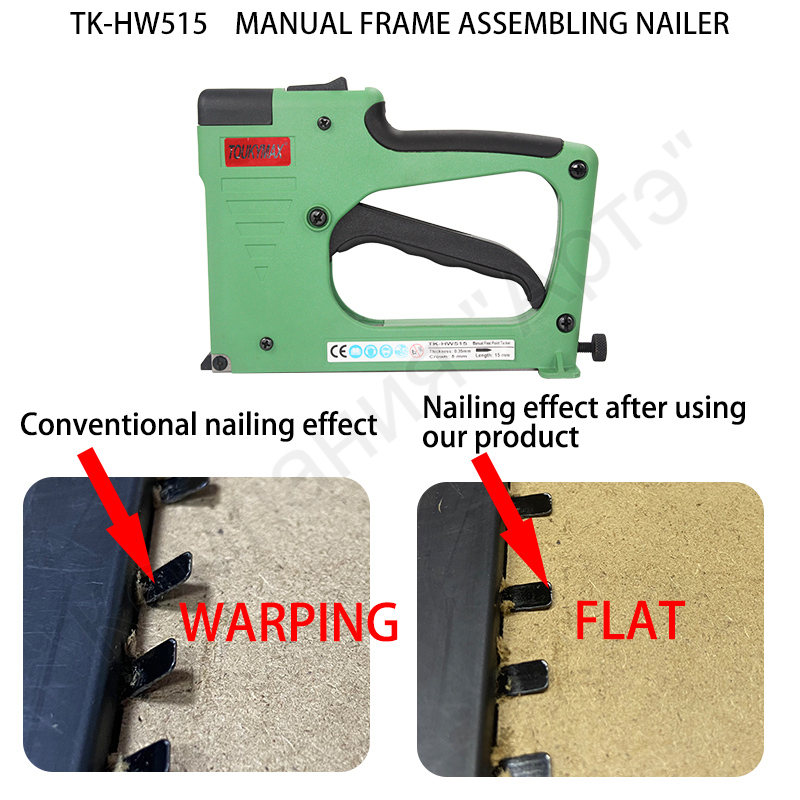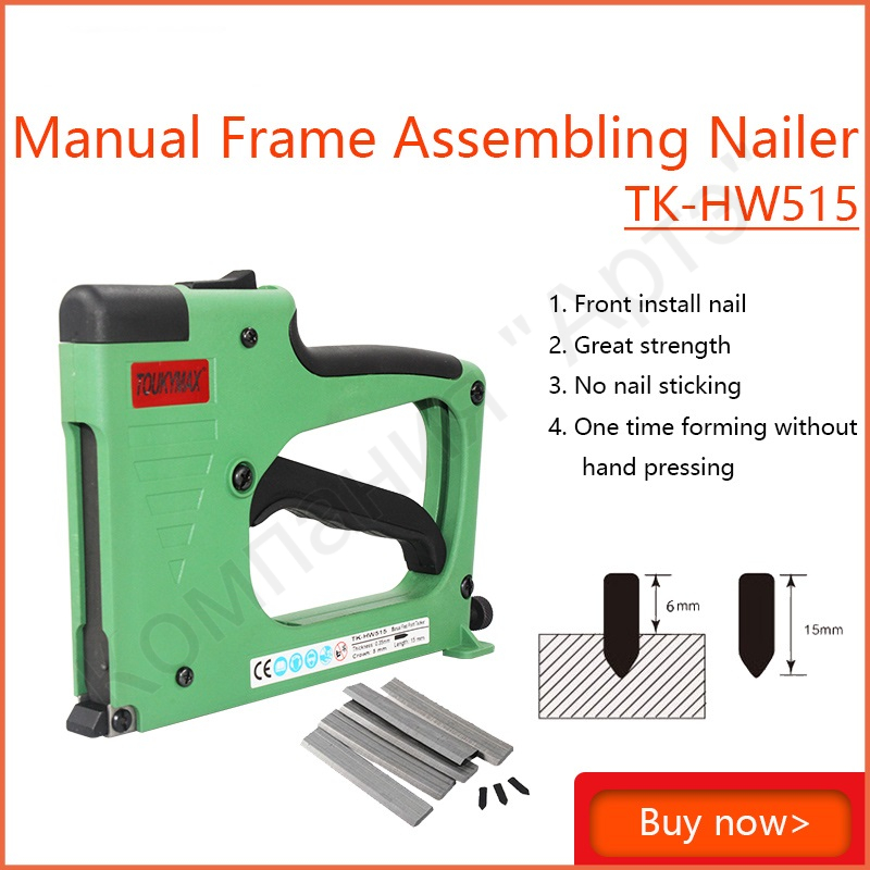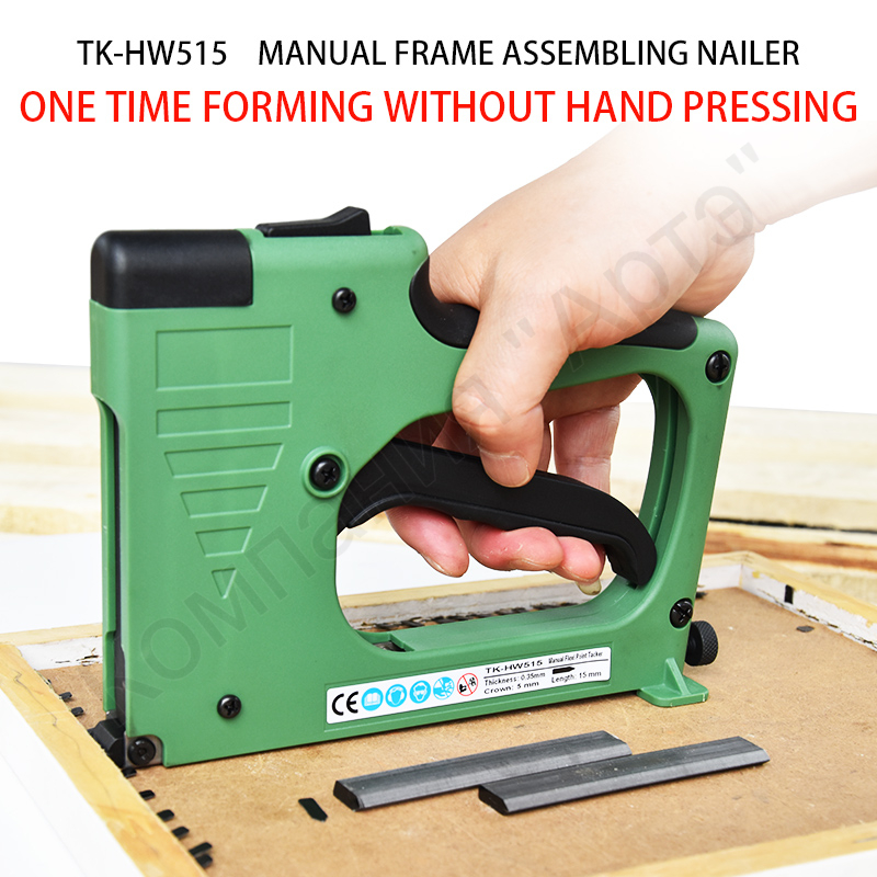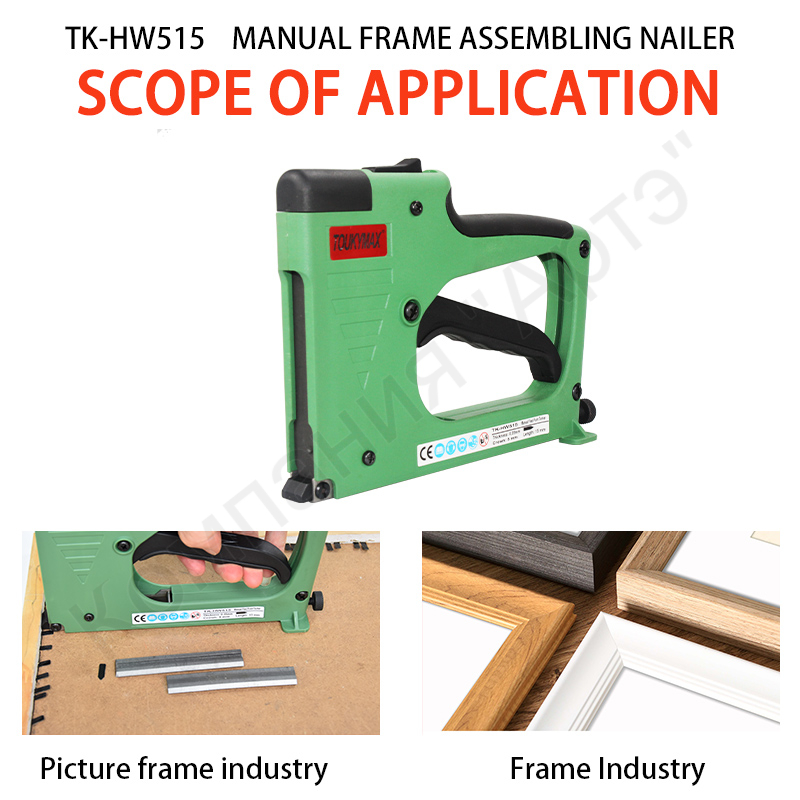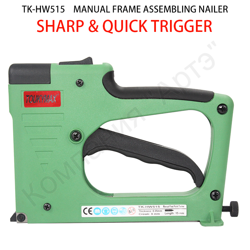 Пистолет с механическим приводом " TOUKYMAX" (Тайвань) зеленого цвета. К нему подходят только гибкие стрелки черного цвета "Гибкие стрелки GS-15-4" длиной 15 мм и толщиной 0.41мм. Для разборки рамы достаточно отогнуть стрелки. Пистолет используют для сборки выставочных, а также фотографических рам в небольших количествах.