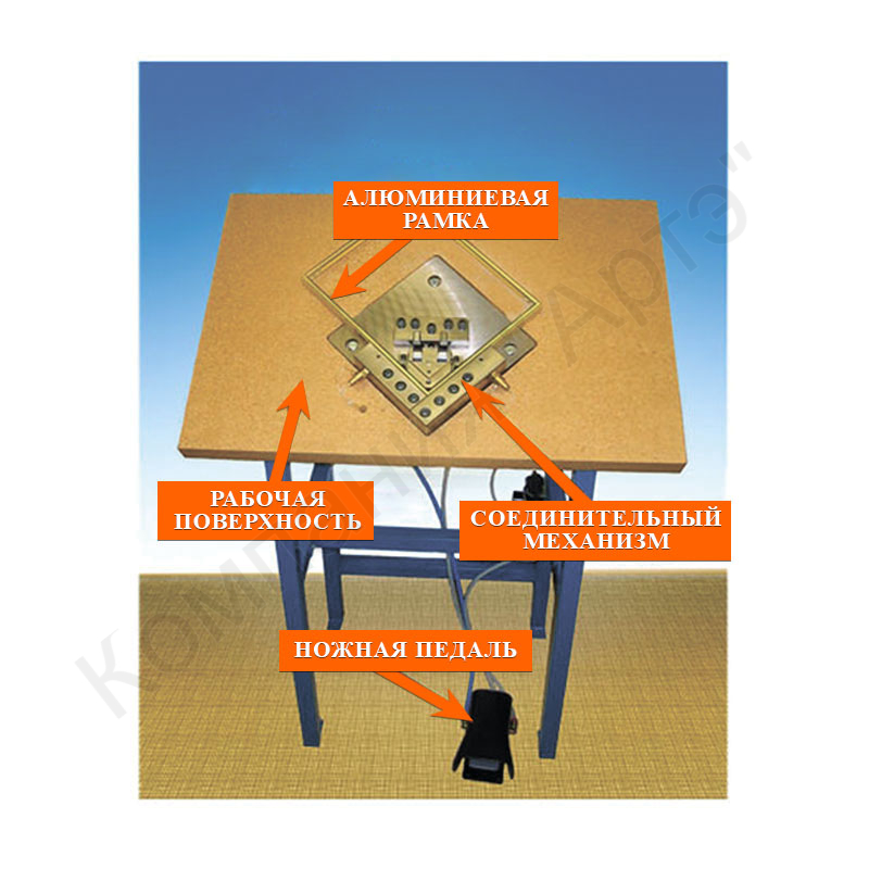 Рабочая поверхность стола выполнена из деревянного композита размером 61x91 см. Установлена она на прочной стальной раме и наклонена под углом 45°. В рабочую поверхность встроен соединительный механизм, на котором происходит скрепление сторон алюминиевых рам за счет использования обжимных уголков.
