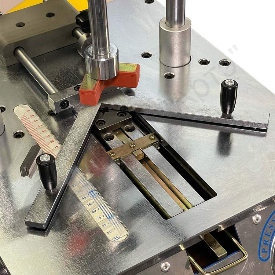 Фиксатор угла обеспечивает стабильность и точность при работе со станком скрепления багетов, позволяя оператору устанавливать нужный угол без дополнительных измерений или регулировок. Это ускоряет процесс работы и помогает добиться однородности углов на всех багетах, что важно для профессионального и качественного выполнения работ.